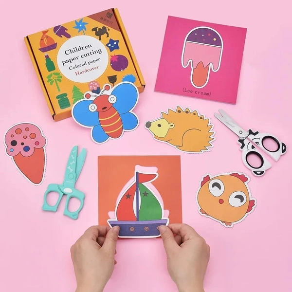 Children's Paper Cut Set, Scissors Craft Set for Children, DIY Scissors Skills for Children, Early Learning Development Toy in Nursery, Children's Safety Scissors + 48 Sheets of Paper Design random only