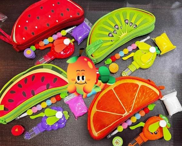 Colorful combo Best for return gifts Contains: 1. Fruit pencil pouch 2. Fruit bubble Fan 3. Air dry clay 1 4. stamp single pc 5. bead pencil