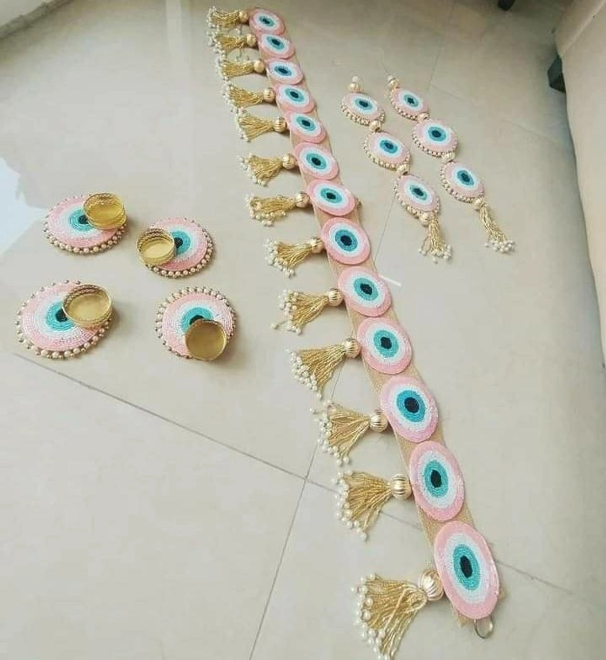 Evil eye combo of bandanwar, 2 hangings and 4 tealight holders. All real picshared Colors available pink, blue Dispatch monday onwards