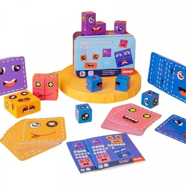 FACE CHANGING PUZZLE GAME The set comes with 16 different wooden emoji cubes and multiple expression cards.