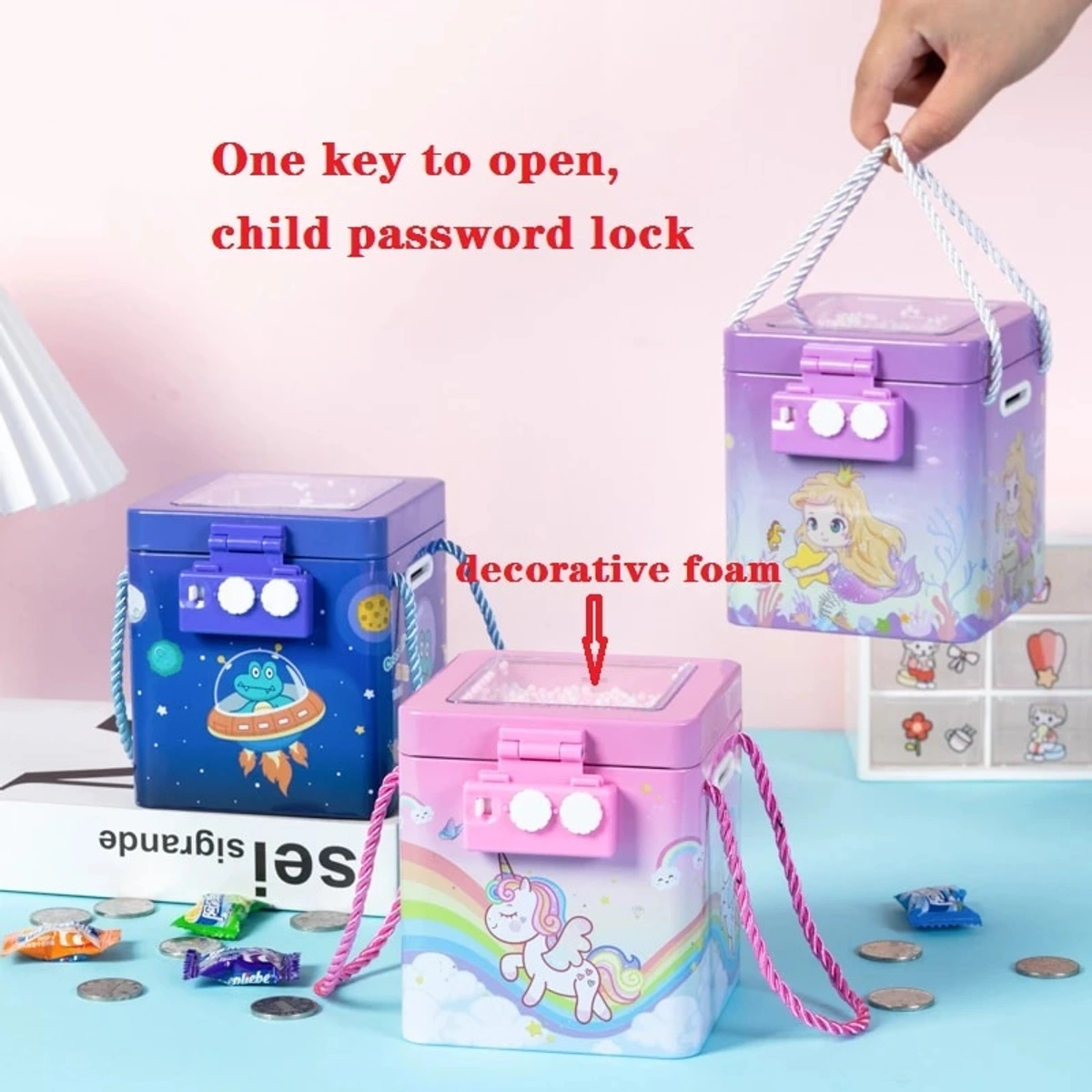 New Cute Unicorn Tinplate Hand Rope Square Password Lock Piggy Bank Children's Cartoon Mermaid Savings Change Coins Money Box