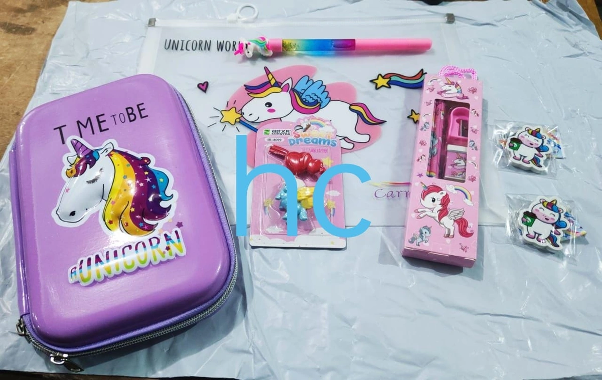 Unicorn pouch combo 1 A4 size pouch 1 smiggle stationery pouch 1 water glitter pen 1 stationery kit 2 erasers 1 eraser set Color random