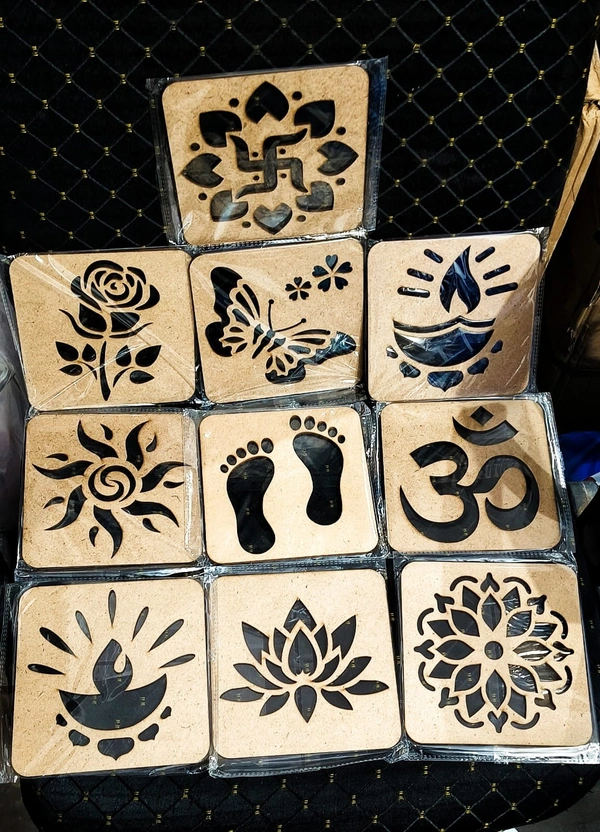 Mdf rangoli stencils set of 10. 6 inches Pls note every set has 10 different designs ( no choice possible) Loose not available