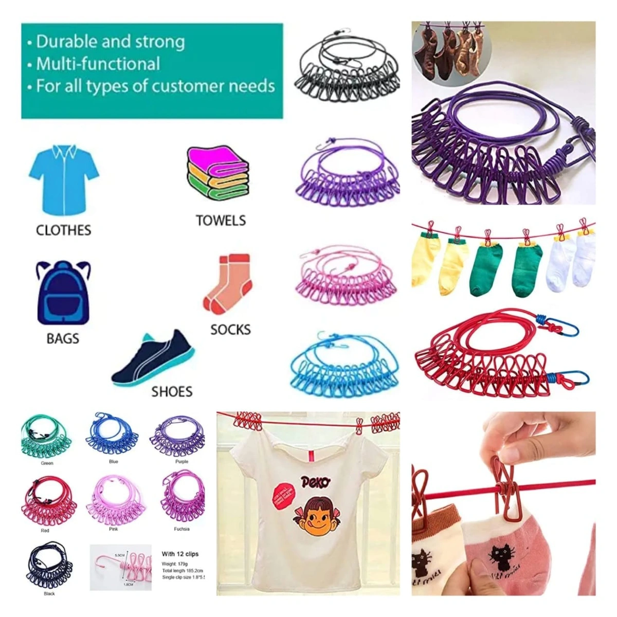 Multi Functional Drying Rope with 12 Clips and 2 Hooks Durable Portable Outdoor Travel Clothesline Rope Clothes Hanging Hook (Multicolor)