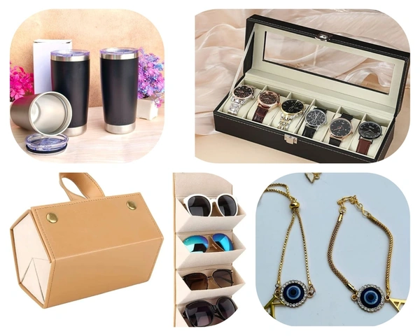 New rakhi 4 in 1 hc combo for adults 1 insulated steel coffee sipper 1 watch organizer of 6 1 foldable goggle case 1 customised initial evil eye rakhi Free roli chawal