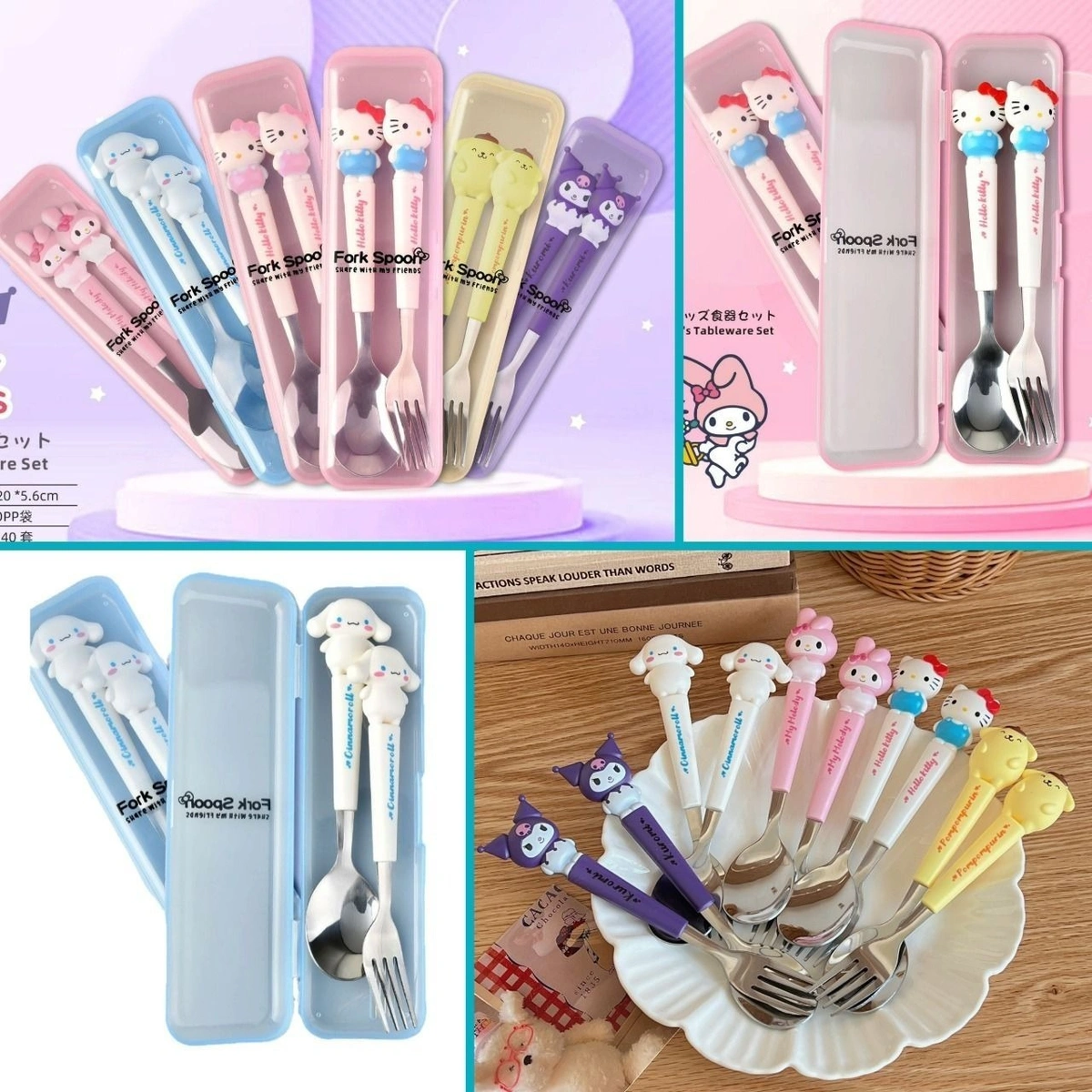STAINLESS STEEL SANRIO FAMILY SPOON & FORK SET - PLASTIC BOX PACKING